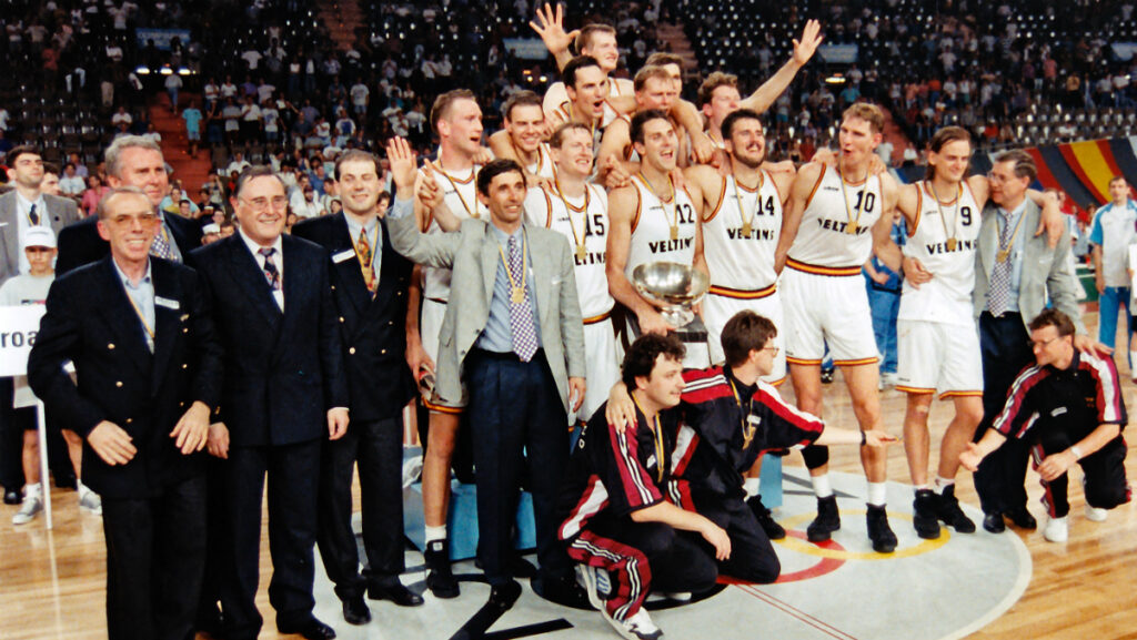 21 Jahre später war der Ort des Geschehens erneut München: die Endrunde der Europameisterschaft 1993. Nach durchwachsenen Leistungen in der Vor- und Zwischenrunde kommt die deutsche Mannschaft ins Rollen und sichert sich am Ende die Trophäe. Das ist bis heute eine der größten Überraschungen in der EM-Historie, schließlich war die DBB-Auswahl für die beiden Europameisterschaften zuvor, 1991 in Rom und 1989 in Zagreb, nicht mal qualifiziert gewesen. Die DBB-Auswahl wird erstmals zur Mannschaft des Jahres in Deutschland gekürt. Unvergessen bleibt der Sieg-Korb des leider schon verstorbenen Christian Welp nach Assist von Kai Nürnberger. Mit Michael Koch, Hansi Gnad und Teoman Öztürk nahmen drei Europameister am Legendentreffen teil (Gnad und Koch bilden derzeit übrigens das Trainergespann beim Rekordmeister Leverkusen).