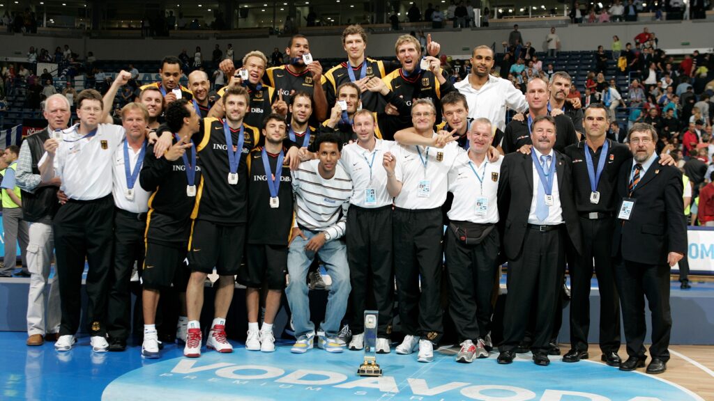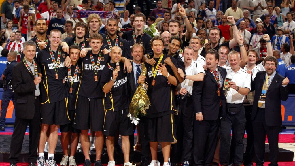 Nach der ersten Olympia-Teilnahme 1972 und der Sensation von 1993 folgt ab der Jahrtausendwende die Generation um den Wunderknaben aus Würzburg, der unsere Sportart weltweit verändert hat: Dirk Nowitzki. Erstmals ein Basketballer, der in Deutschland über die Basketball-Szene hinausstrahlt. 2001 hätte es für seine Generation bereits beinahe mit der ersten Medaille geklappt. Im Halbfinale der EM 2001 in der Türkei war die „neue“ Mannschaft nur ein Foul gegen die Gastgeber davon entfernt, ins Endspiel einzuziehen. Ein Jahr später klappte es mit dem ersten Edelmetall bei einer Weltmeisterschaft: Bronze 2002 in den USA. Drei Jahre später, 2005, folgte Silber bei der EM in Serbien.