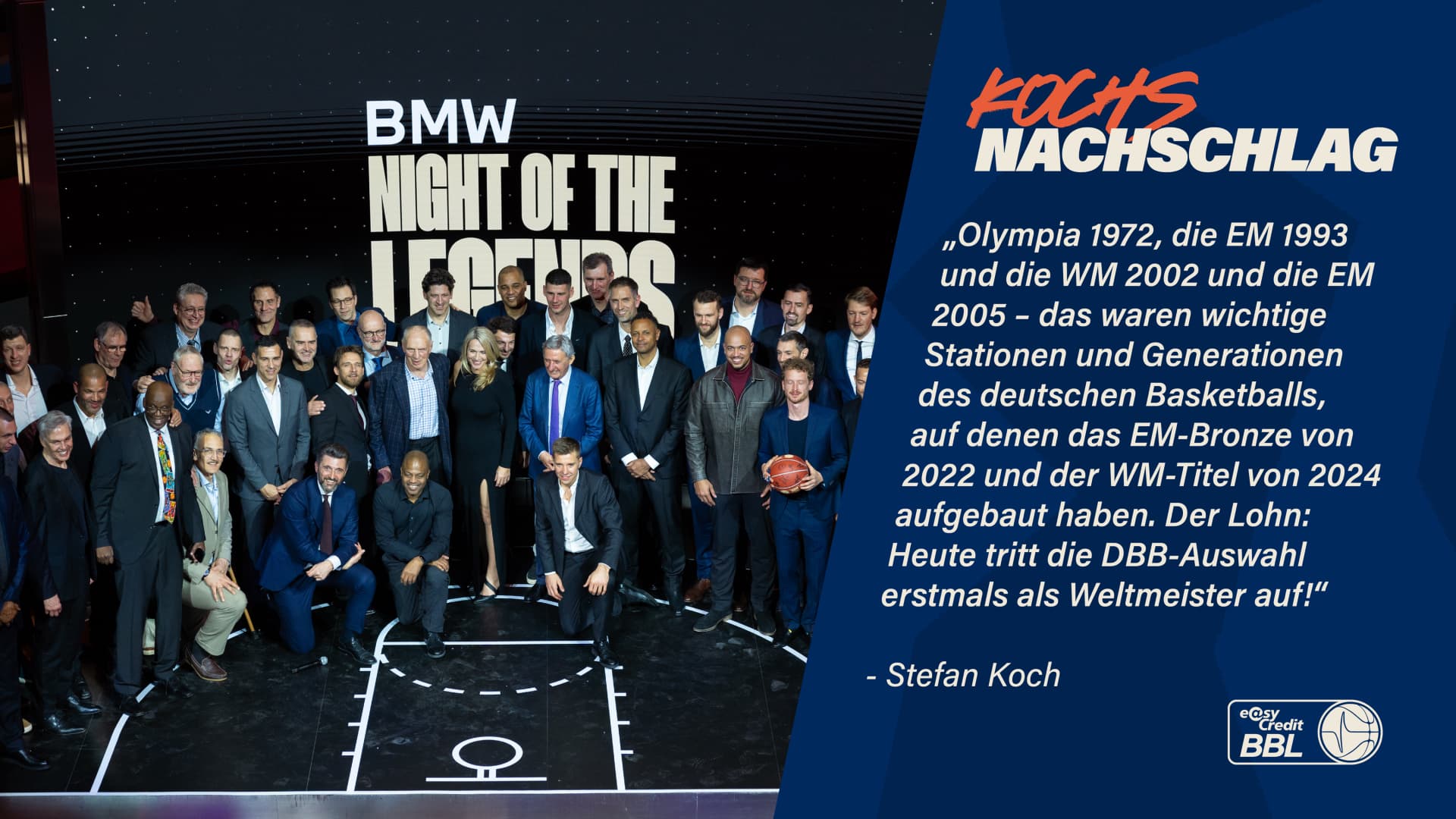 Bei der „BMW Night of the Legends” im Rahmen des Pokalwochenendes waren auch Nationalspieler aus den vier wichtigsten Epochen des deutschen Basketballs anwesend. Am heutigen Donnerstag tritt die DBB-Auswahl erstmals als amtierender Weltmeister auf, und aus diesem Anlass schaue ich zurück auf vier Generationen, die entscheidend dazu beigetragen haben, Basketball in Deutschland zu dem zu machen, was es heute ist.