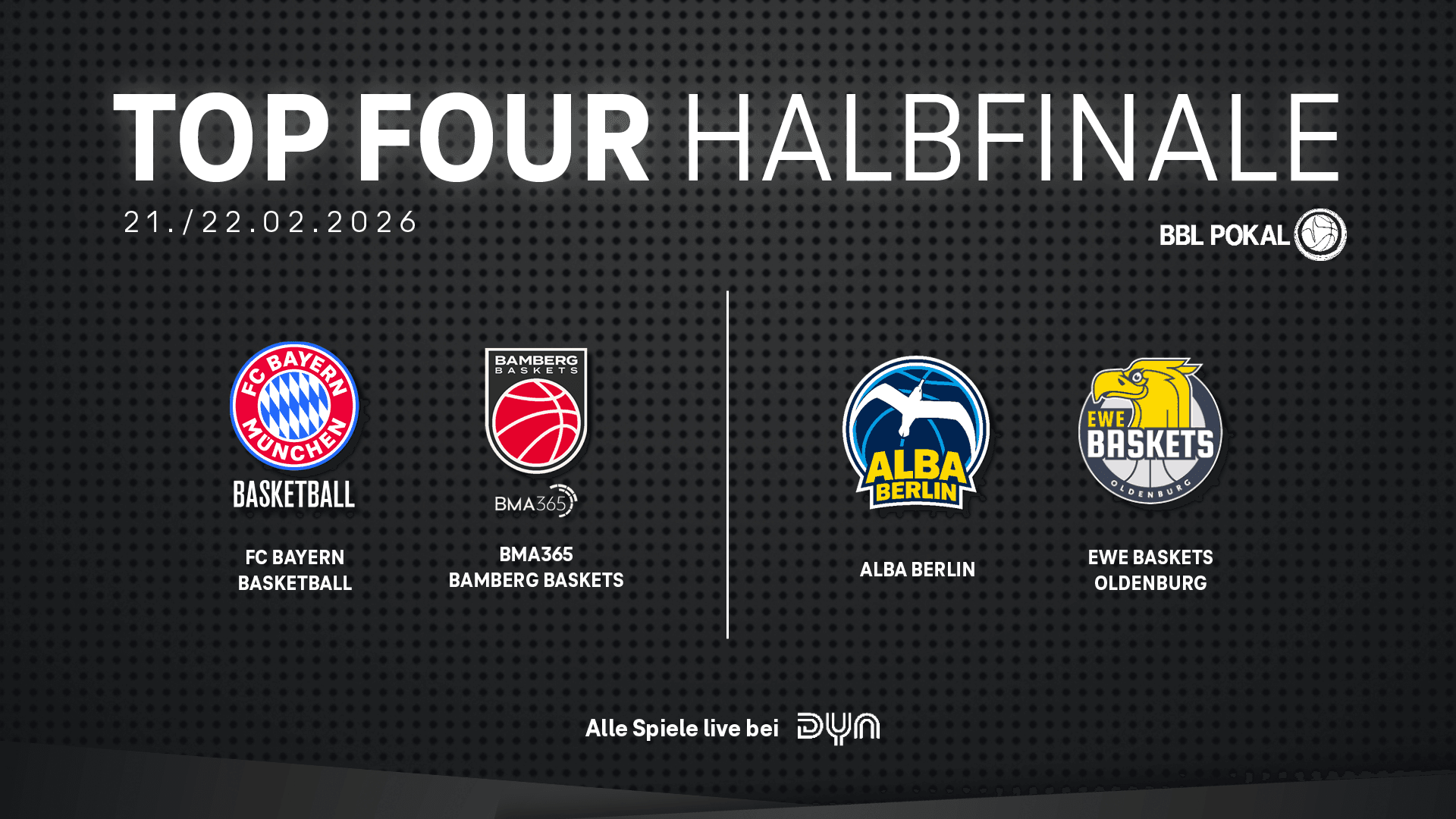Im Lostopf befanden sich neben den BMA365 Bamberg Baskets und dem FC Bayern München Basketball auch die EWE Baskets Oldenburg und ALBA BERLIN. Diese vier Teams haben sich in den vorangegangenen Partien den Einzug ins TOP FOUR 2026 erkämpft und damit die Chance auf den ersten Titel der Saison.